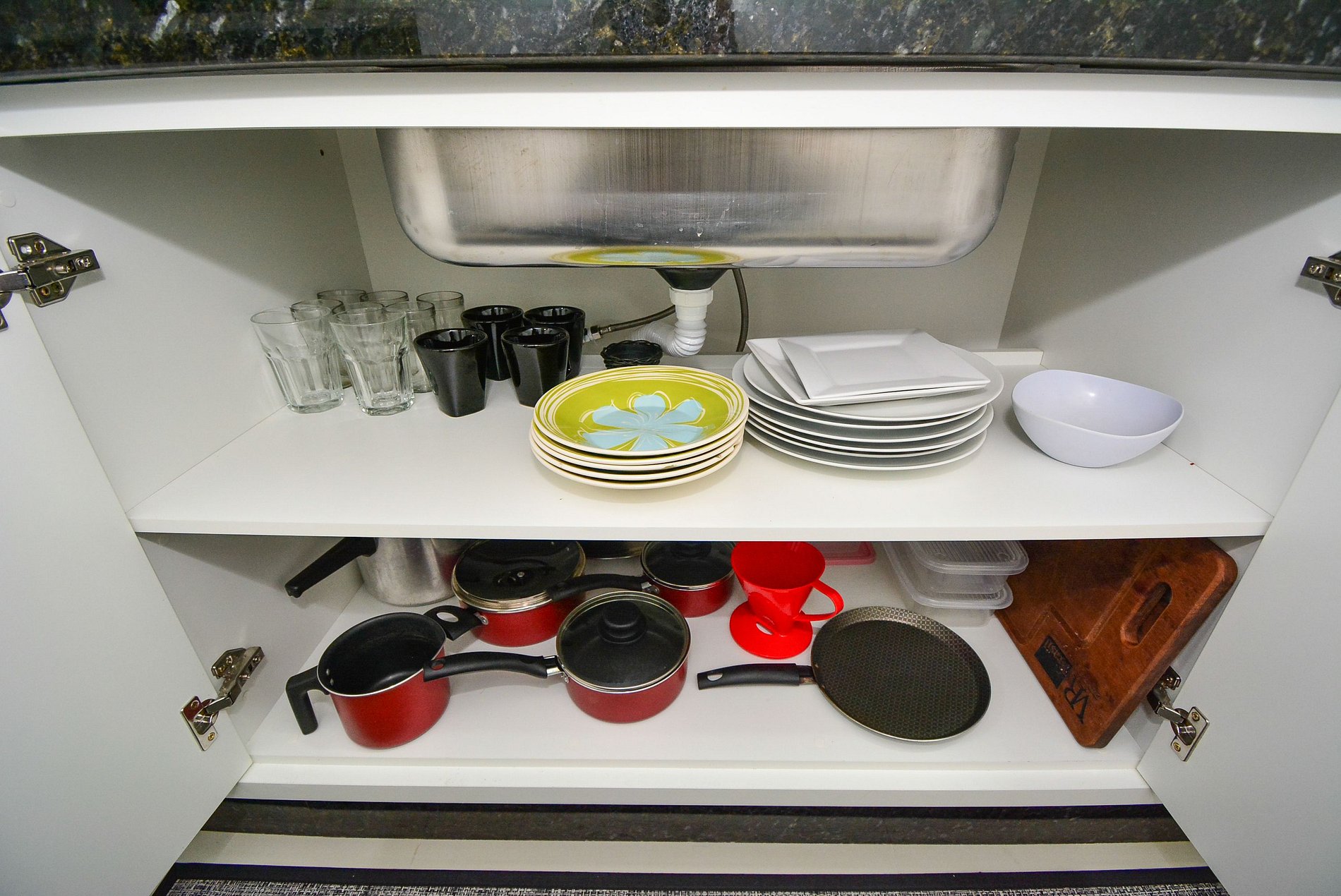 • Geladeira, fogão, micro-ondas, chaleira elétrica, panelas, utensílios de cozinha