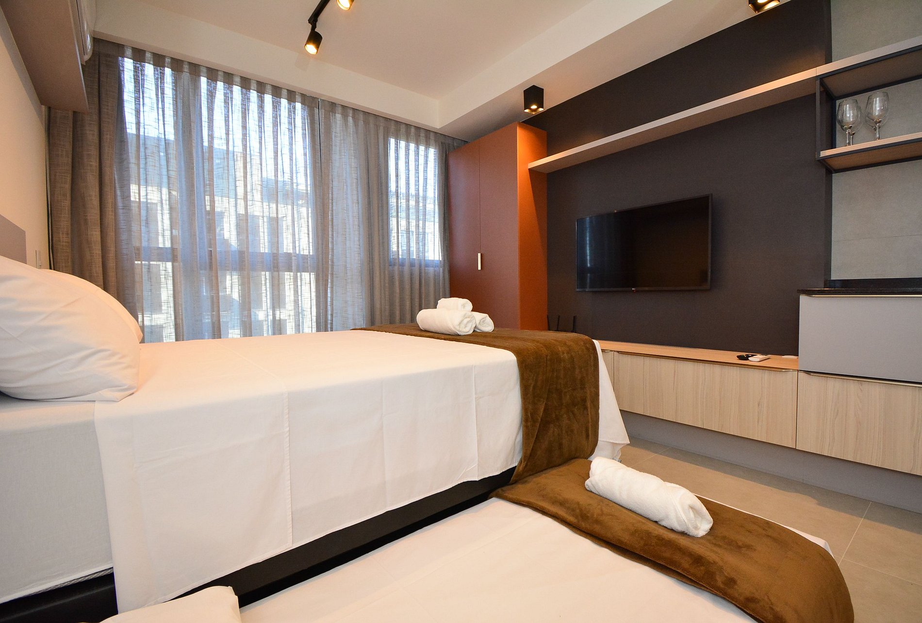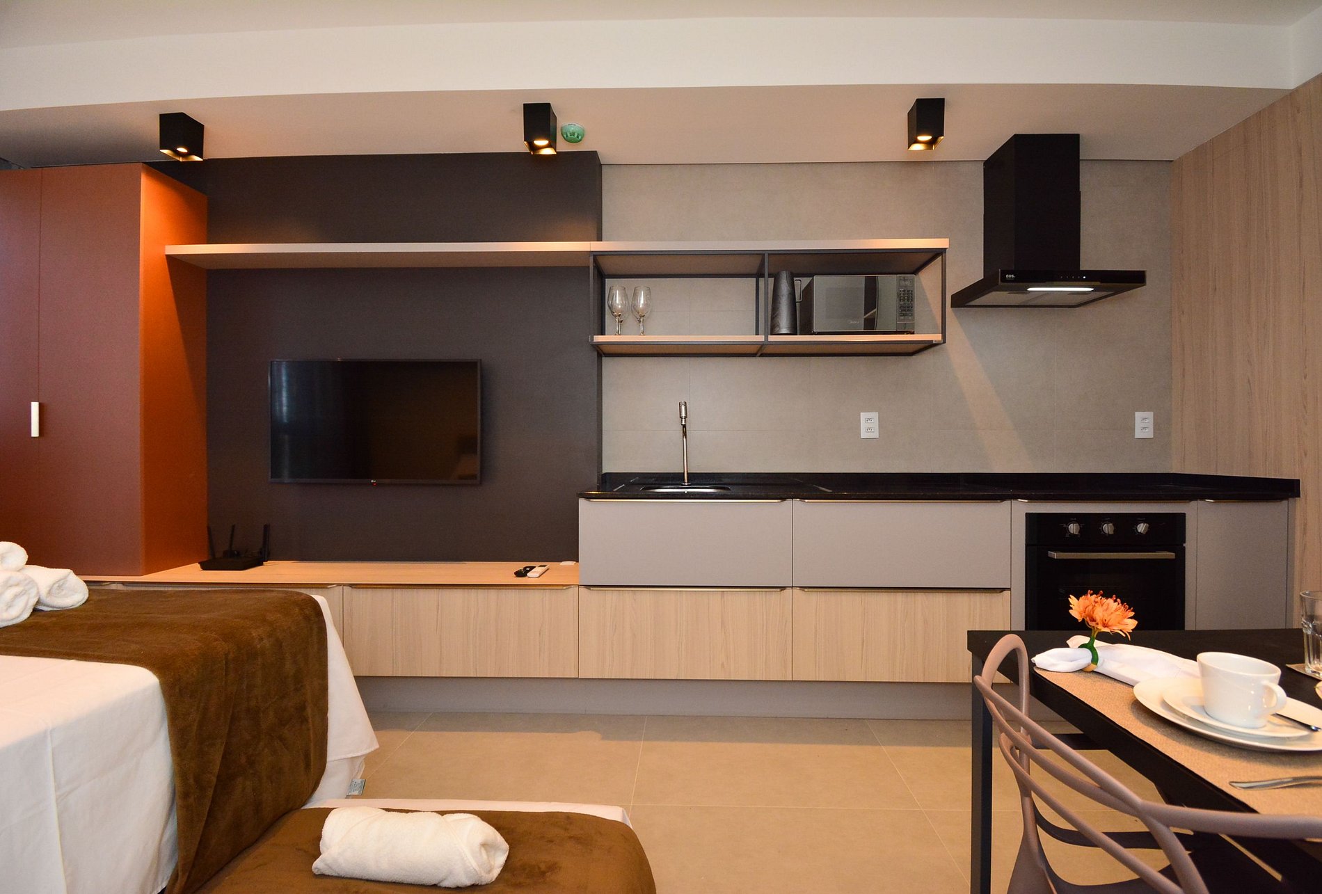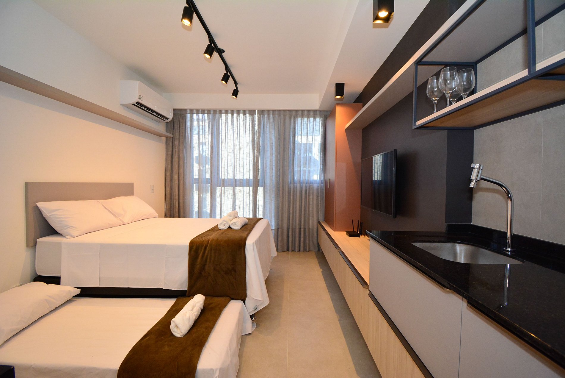 O acesso ao studio é feito por meio de fechadura eletrônica com senha personalizada, enviada antes da chegada, dispensando o uso de chaves físicas e oferecendo ainda mais praticidade.