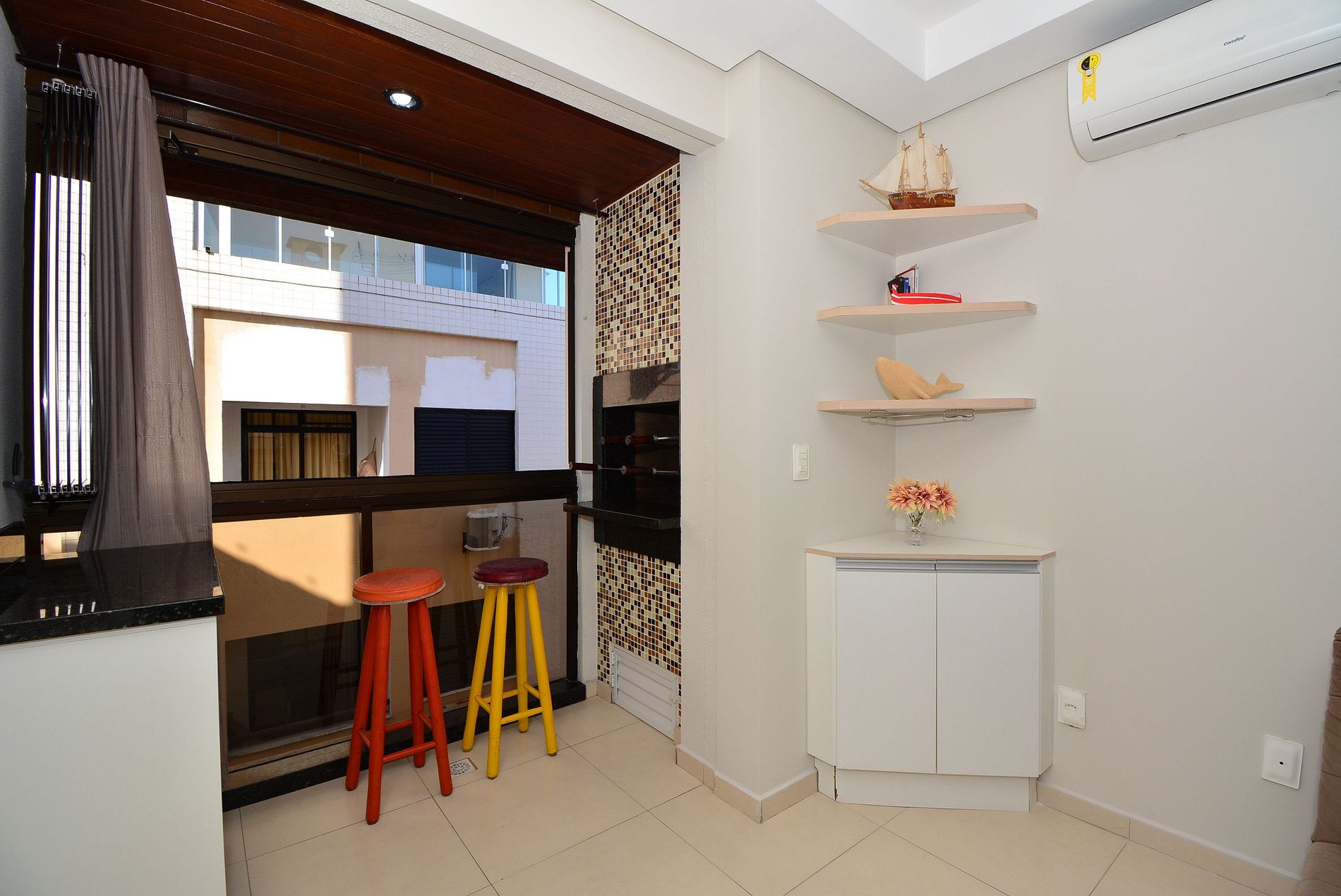 O ambiente é amplo e acolhedor, com sala integrada à churrasqueira, cozinha completa e banheiro social.
