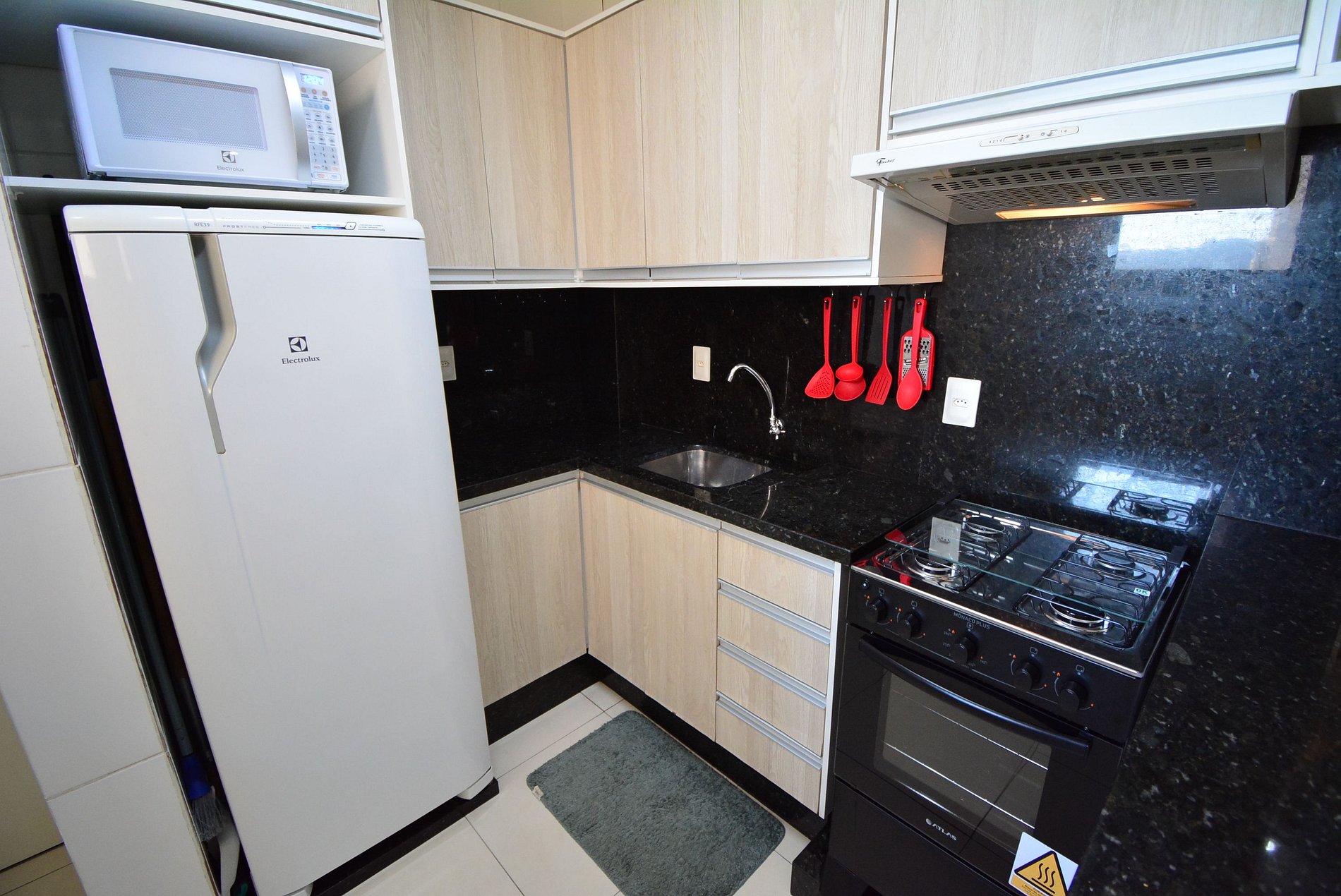 • Cozinha completa (geladeira, fogão, micro-ondas, panelas, utensílios e talheres)
