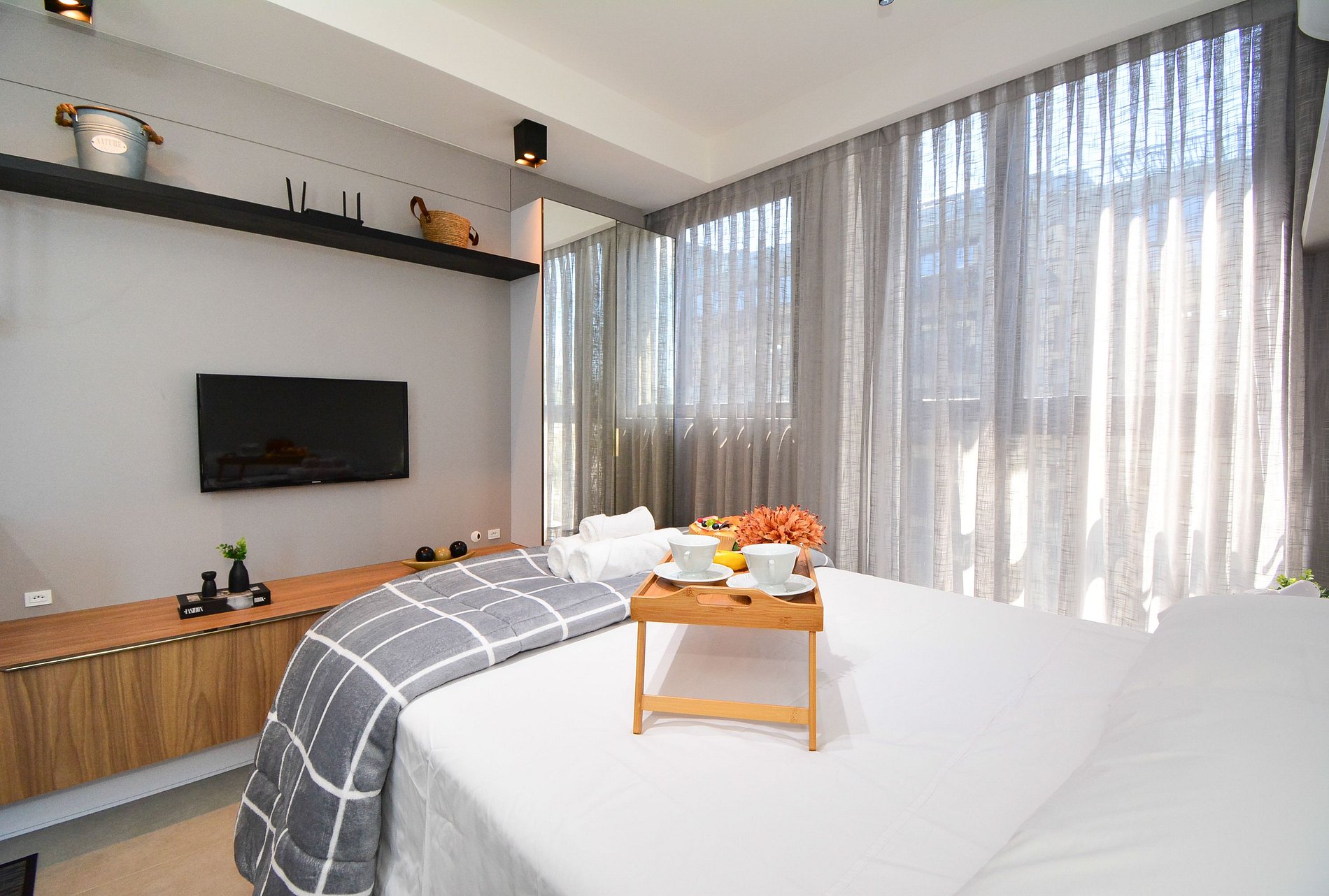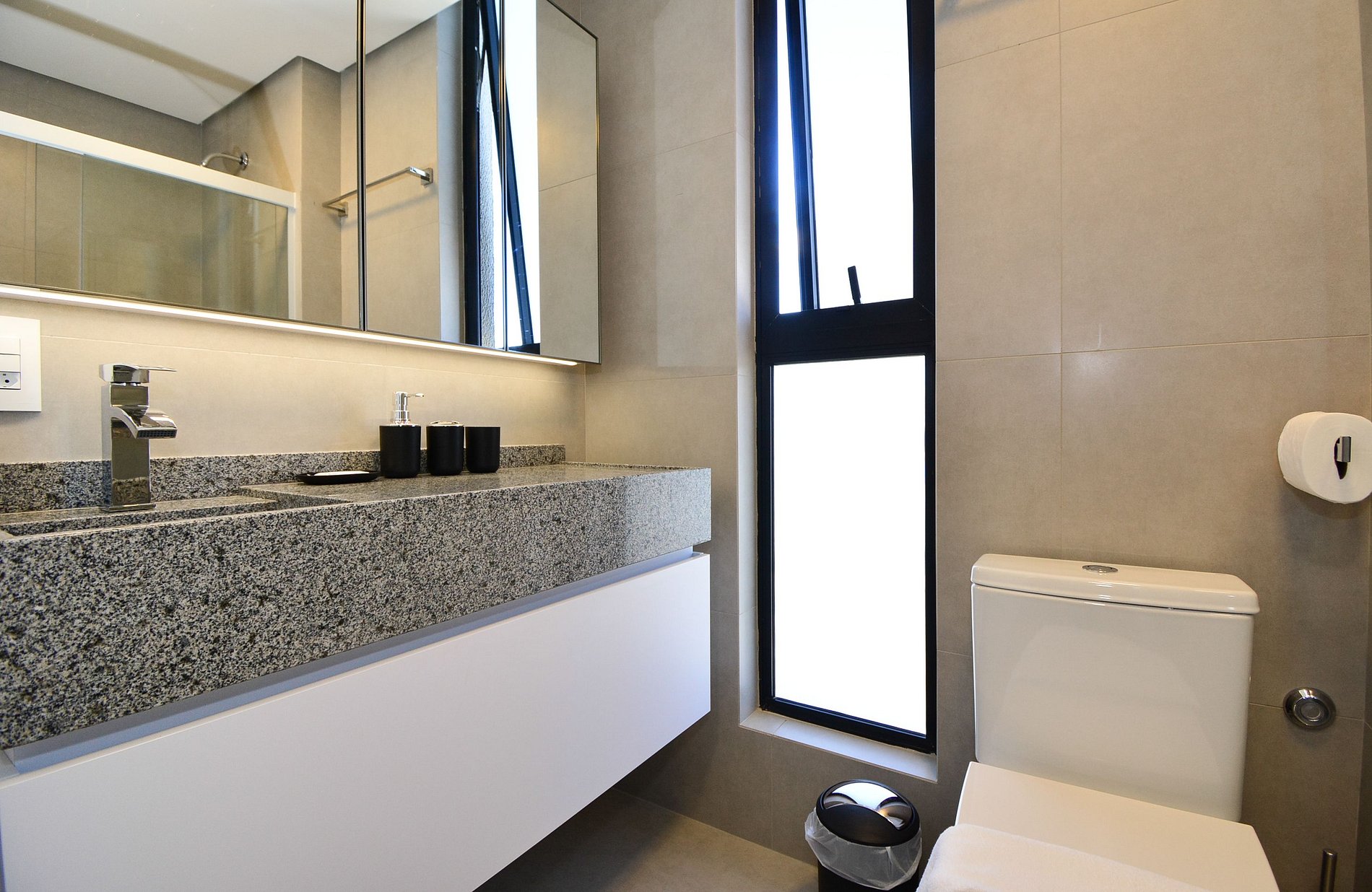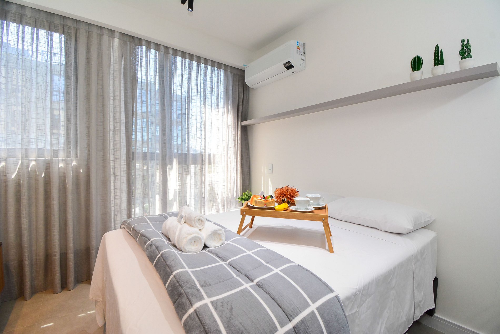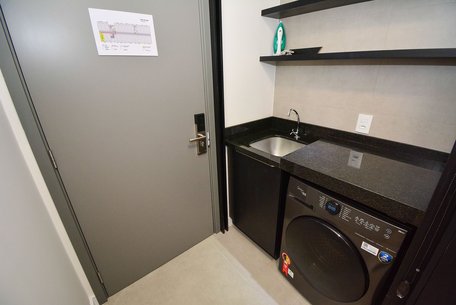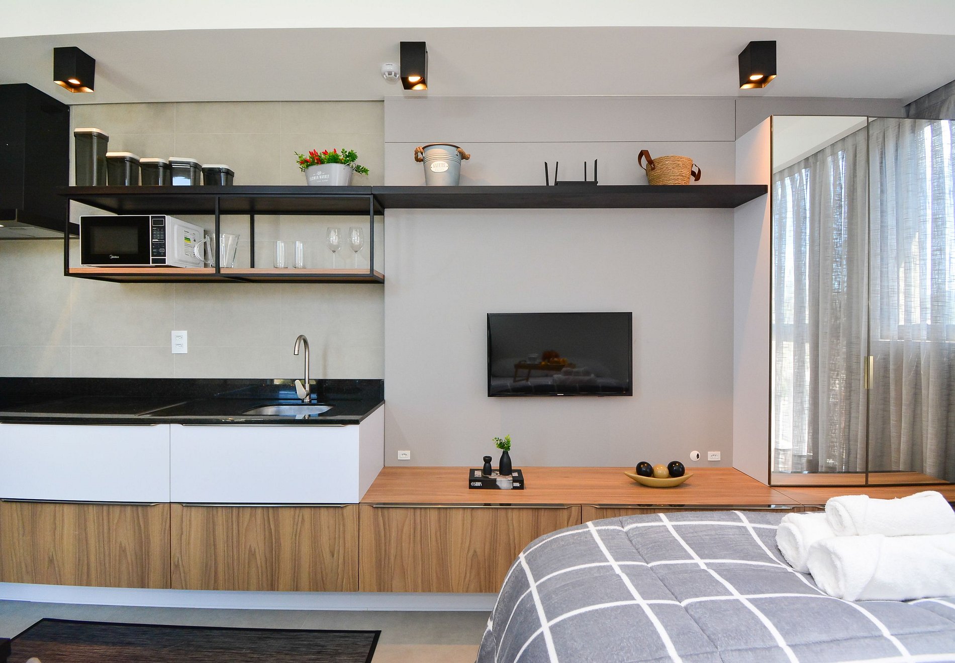 O acesso ao studio é feito por meio de fechadura eletrônica com senha personalizada, enviada antes da chegada, dispensando o uso de chaves físicas e oferecendo ainda mais praticidade.