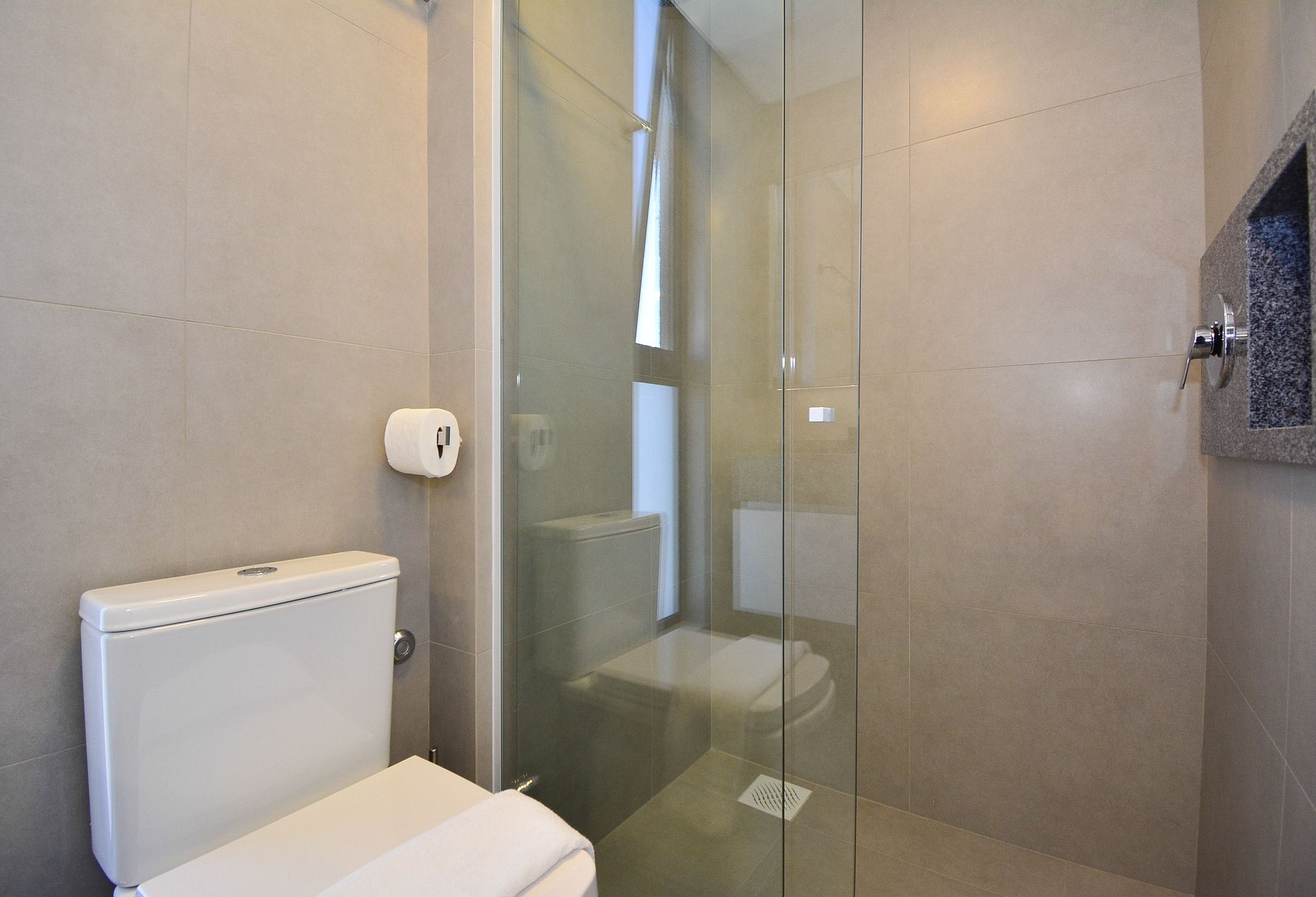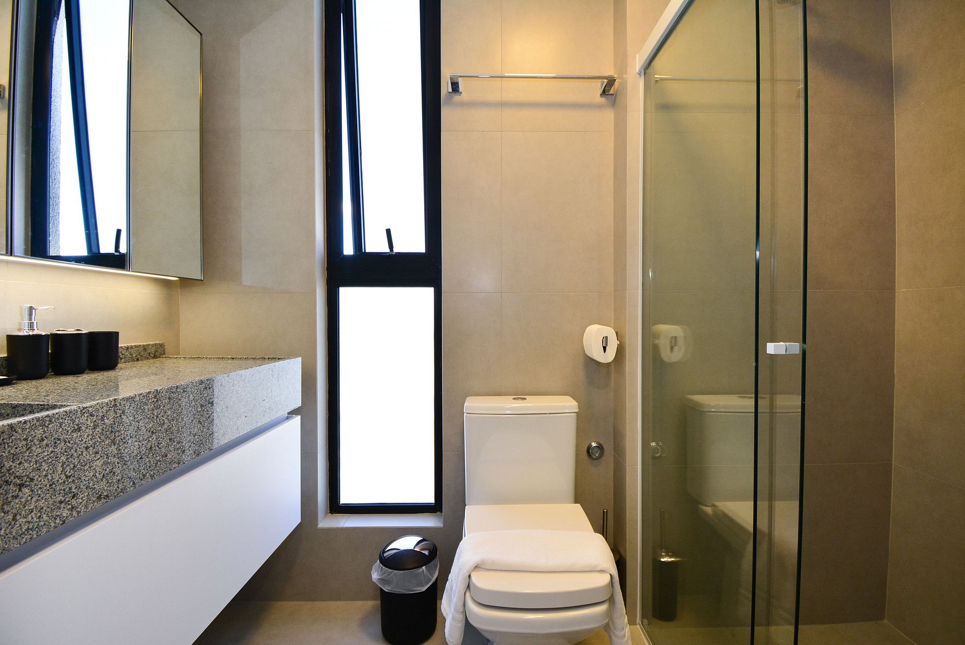 • Banheiro privativo com box de vidro, chuveiro a gás, toalhas de banho e rosto disponíveis, secador de cabelo.