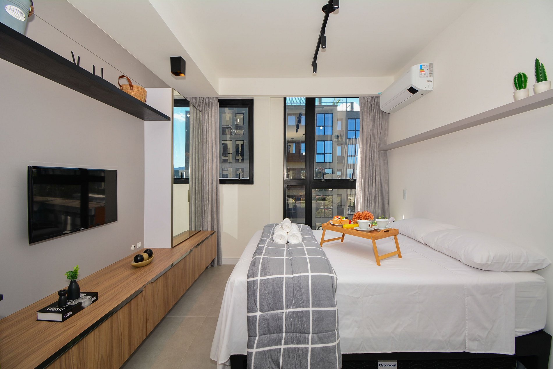 Studio moderno em frente à UFSC e HU, a 1 km do Shopping Villa Romana. Ideal para quem busca praticidade, conforto e localização estratégica.
