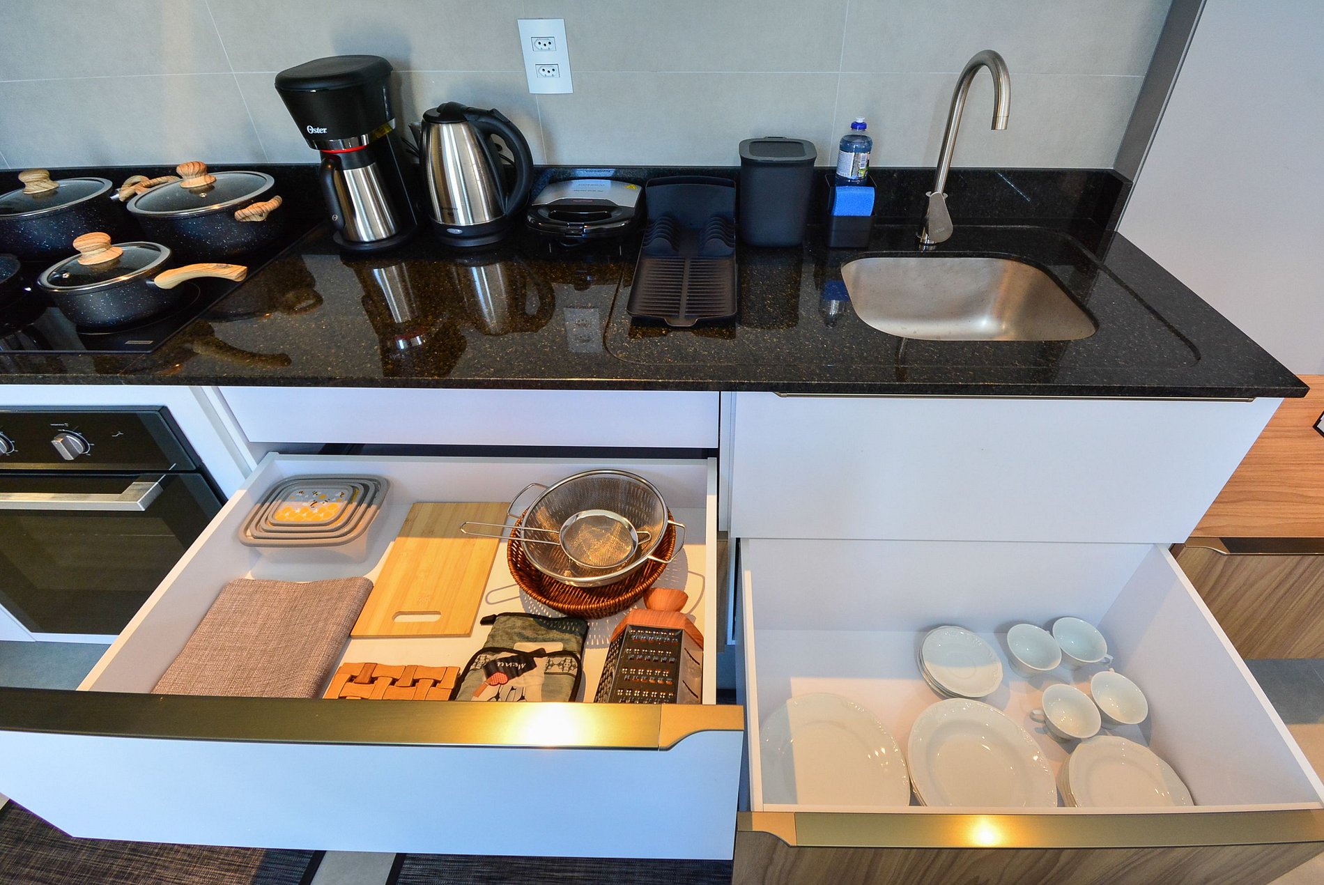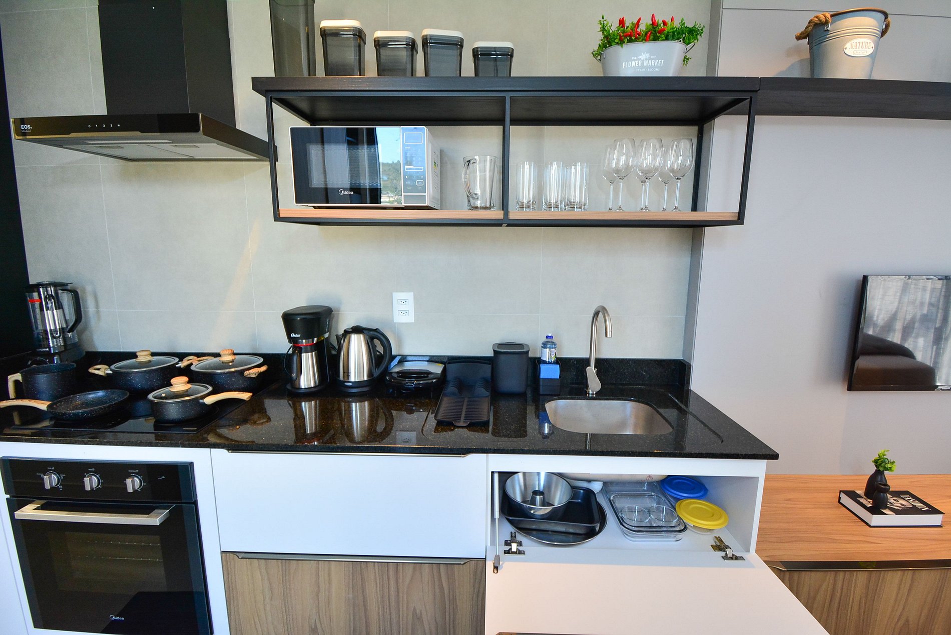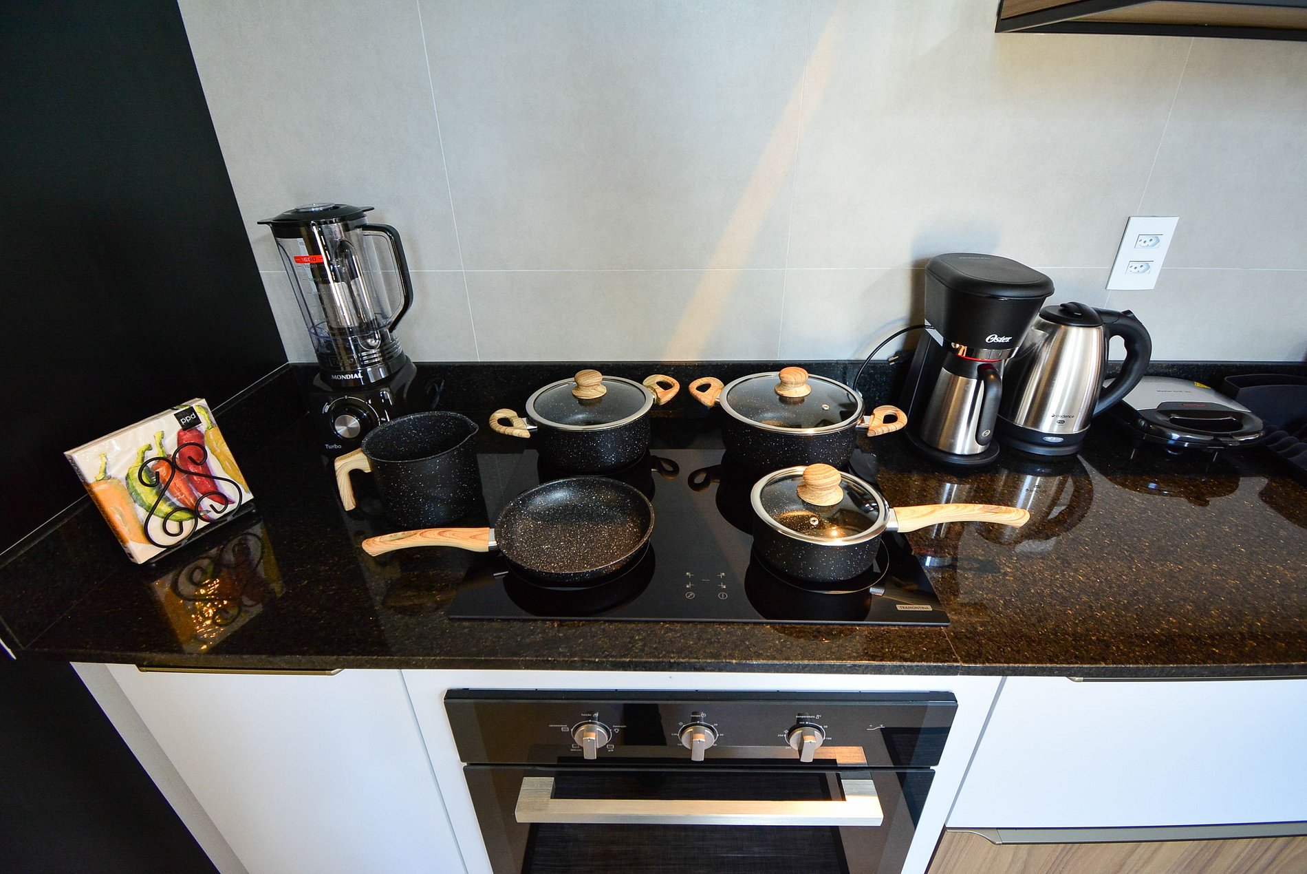 • Cooktop, micro-ondas, geladeira, chaleira elétrica, sanduicheira, liquidificador, panelas variadas.